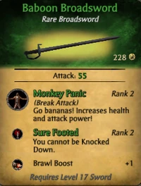 The Baboon Broadsword is a powerful Rare Broadsword that gives its user a Monkey Panic ability, increasing the wielder's Health and attack power, and grants a Sure Footed defense against being knocked down. This Weapon also provides a small boost to the wielder's Brawl Skill.