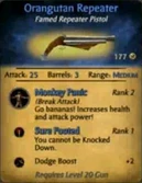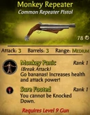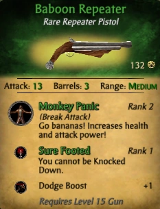 The Baboon Repeater is a rare Repeater Pistol that gives its user the Monkey Panic Break Attack, putting you on a wild rage, increasing your health and attack. This repeater also has the Sure Footed ability, allowing you to not be knocked down by a Stump, or by Ramming Speed while sailing.