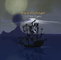 The Black Harbinger is a powerful skeleton War Frigate in service of Jolly Roger. This vessel carries three deck cannons and seven broadside cannons on each side.