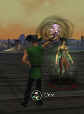 Cure is a voodoo doll hex that is an improved form of Heal. It will restore more health, but also remove any debuffs or negative effect from an ally (like poison, stunned, enemy voodoo hexes, Grave Shackles, etc.). This ability is similar to Heal but more effective and even stronger while using a spirit doll.