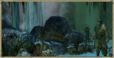 At the second junction, the player can find a large group of Spineskulls and Flotsam. Continuing straight from the bridge, the player will come across the mast of a wrecked ship, with a group of Seabeards and Molusks. Following the curve in the cavern, the player will come across a smaller junction with a waterfall around a large stony pillar. To the left, the player can find Thrall Hall and the entrance to Forsaken Shallows, guarded by powerful Urchinfists and Thrall Captains. To the right, Jimmy Legs can be found, guarded by Molusks or Seabeards.