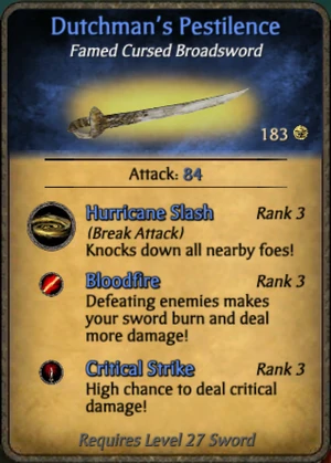Dutchman's Pestilence is a Famed Cursed Blade. This sword has three very powerful abilities: Hurricane Slash, which can knock down nearby foes, Blood Fire, which increases damage after every enemy the user defeats, Critical Strike, giving the weapon a high chance to deal bonus damage.