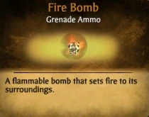 Fire Bomb is a flammable grenade that sets fire to its surroundings. When thrown, this grenade erupts into a fire ball. Any enemy struck will take damage, plus continue to take damage as the flames burn.