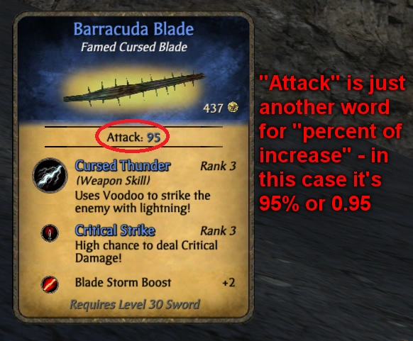 Next, your weapon of choice. I was using Barracuda Blade with an Attack of 95. "Attack" is just a simplified way of saying "percent of increase".
