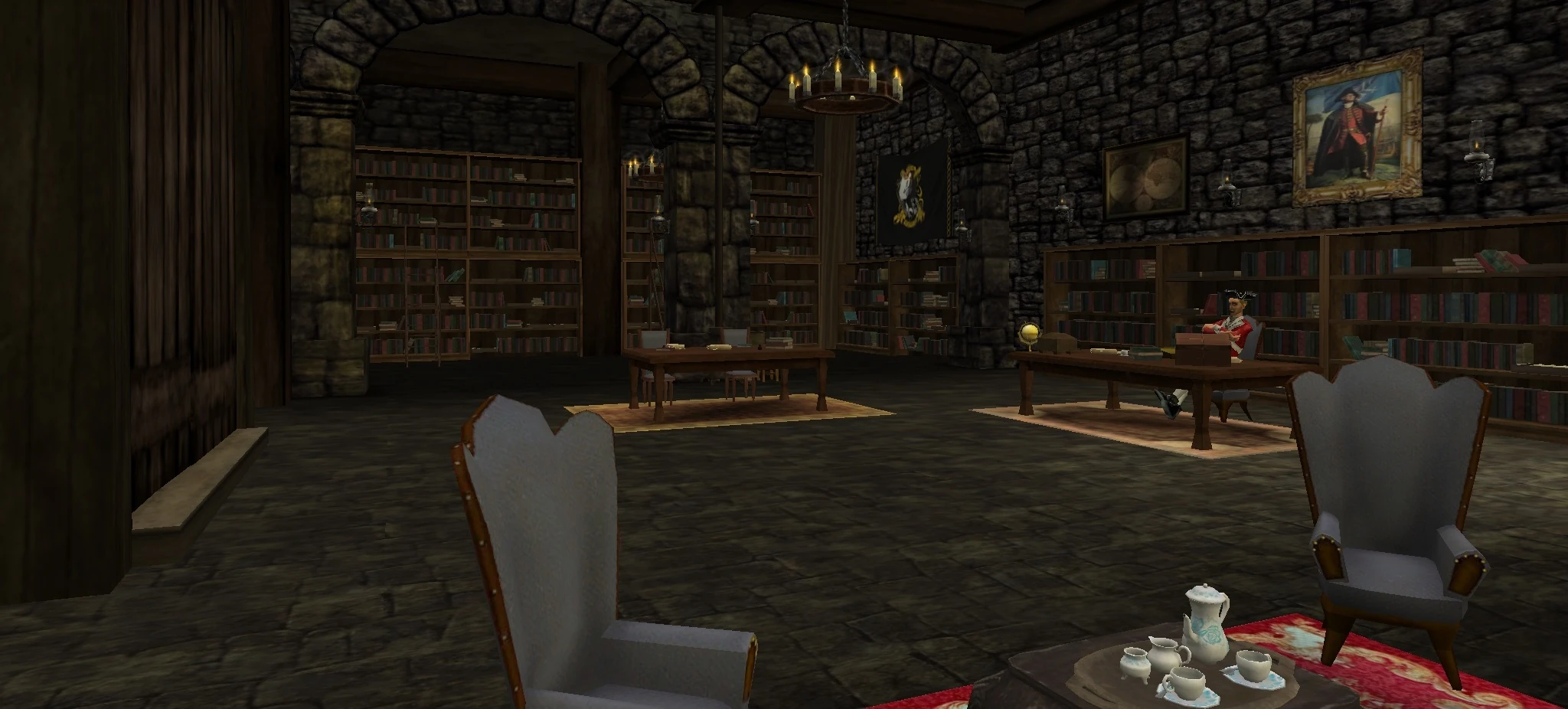 Deep inside the fortress walls, behind a heavy door, is a secluded room. The walls of this room are lined with floor to ceiling bookcases and shelves. The Royal Navy and Black Guard keep a substantial library here of official manuals, documents, records and logs. This area is not heavily guarded. Apparently, the Navy doesn't expect many pirates to be interested in stacks upon stacks of books and journals.