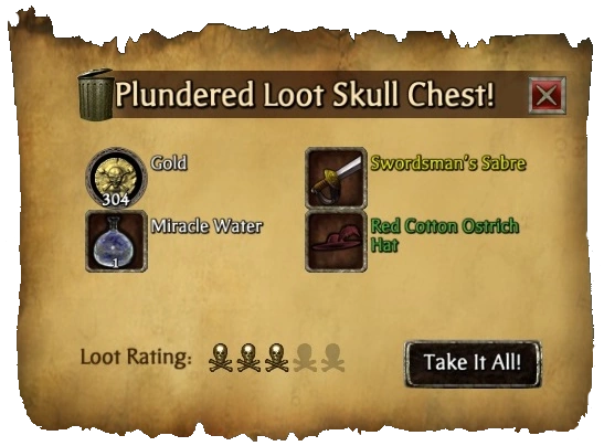 The pirate can select which looted items to take or leave - or click "Take It All!". Select individual items by either double-clicking on them OR by dragging them to your inventory. Click the Red X once you're done taking your pick of the rewards.