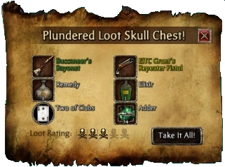Loot Skull Chests are randomly rewarded after defeating an enemy. These chests may contain anywhere from 1-6 items. The Loot inside can vary from gold, ammo and cards, to clothes and new weapons- even the Lost Weapons. Often the items in a Skull Chest are (typically) more valuable than those found in a Loot Pouch or regular Loot Chest. It is common for them to have large amounts of gold in them and better weapons. There is also a chance to get a loot skull chest by sinking ships at sea.