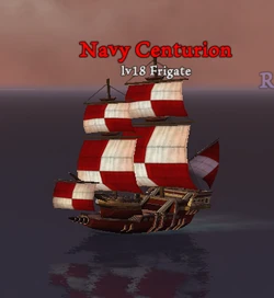 The Centurion is a class of medium Frigate in service of the Royal Navy. This vessel carries five deck cannons and seven broadside cannons on each side.