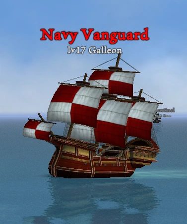 The Vanguard is a type of Galleon in service of the Royal Navy. This vessel carries four Deck Cannons and nine broadside cannons on each side.