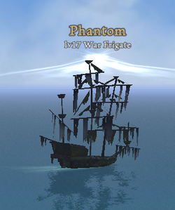 The Phantom is a level 17-19 skeleton War Frigate fighting in service of Jolly Roger. This vessel carries seven deck cannons and ten broadside cannons on each side.