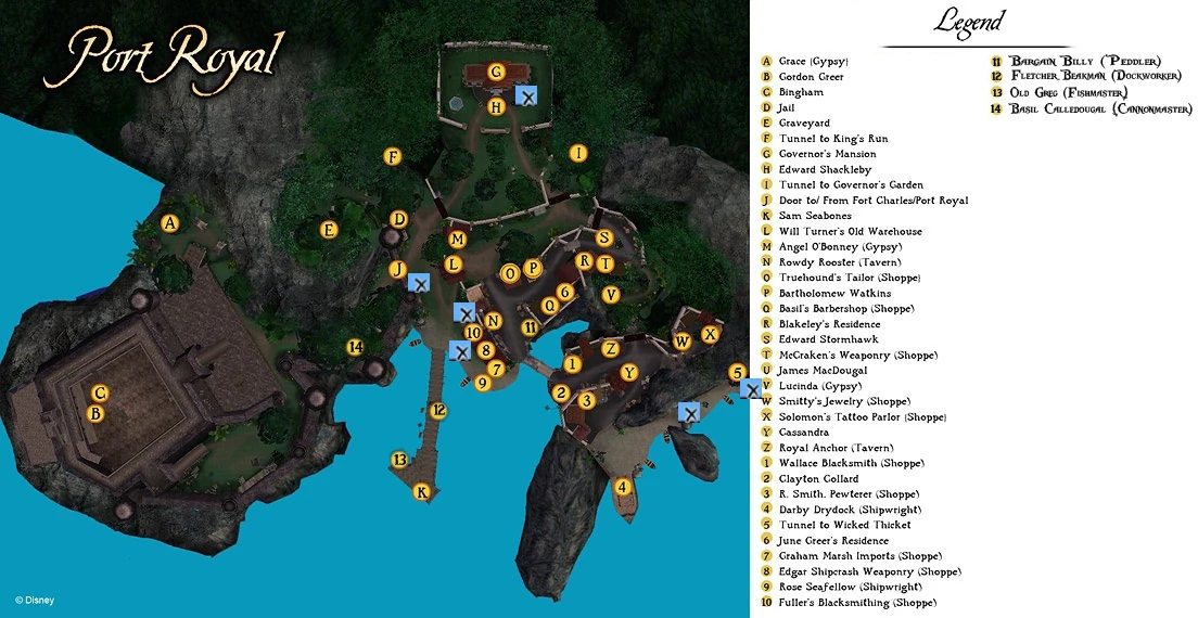 Port Royal was a major city and harbor in the Caribbean, (and not to be confused with Port Royal in New France) situated on the western end of Palisadoes in Jamaica. It was founded by the English, and the Royal Navy maintained a presence at the governmental Fort Charles. It doesn't have many enemies and is normally a peaceful town.