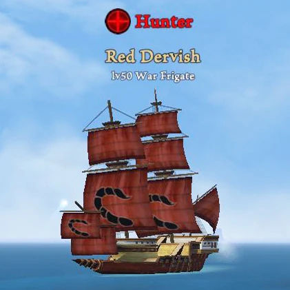 The Red Dervish is a high-level Bounty Hunter War Frigate. This ship appears as part of the Scoundrel of the Seas update. Like all bounty hunter ships, this vessel will pursue any pirate who has been plundering a large number of ships and will relentlessly give chase until sunk. It bears a scorpion tail emblem.