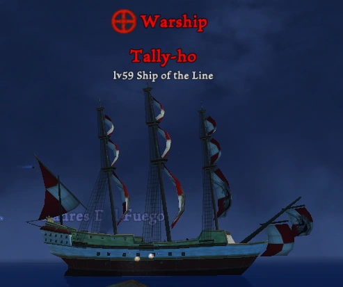 The Tally-ho is a Warship Ship of the Line appearing around the level of 59-61. It spawns as part of the Scoundrel of the Seas. Like all Bounty Hunters and Warships, this vessel will pursue any pirate who has been plundering a large number of ships and will relentlessly give chase until sunk. With armor that is nearly unbreakable, this is a highly dangerous Warship; this ship goes faster than the ships in the treasure fleets. She uses firebrand for broadsides and explosive for deck cannons. Her sails, like those of the En-Garde, have a unicorn emblem on them.