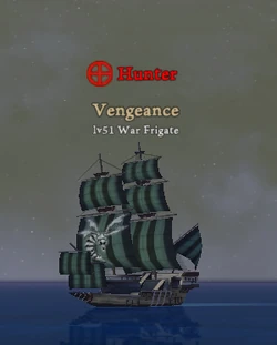 Vengeance is a Bounty Hunter War Frigate that hunts ships in the Pirate At Large and Rogue on the Run Scoundrel of the Seas Ranks. It appears at levels 49-51.